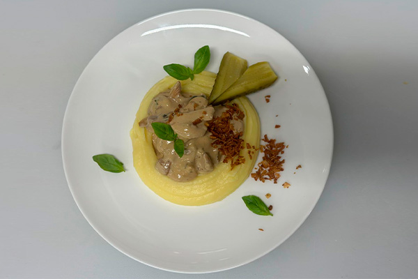 Индейка, шампиньоны, лук, маринованный огурец, сливки, сметана, горчица, картофельное пюре